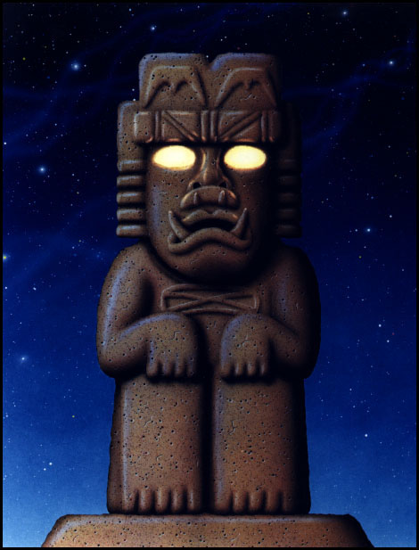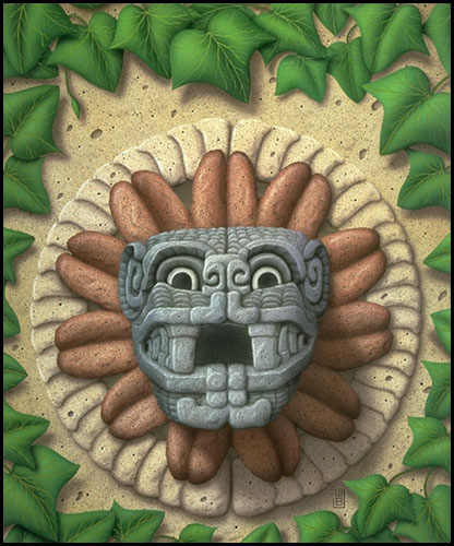 The Feathered Serpent or Precious Twin. He is the god of intelligence and self-reflection. As the lord of the East he is associated with the Morning Star, Venus Rising. Quetzalcoatl took his place in the heavens and initiated the second age of the world. The earth was peopled with men who ate only pine nuts. This era came to an end on day 4 wind when Tezcatlipoca overthrew Quetzalcoatl and sent a great wind which devestated the earth. The few surviving men were changed into monkeys. | Quetzalcoatl | ||||||||||||||||